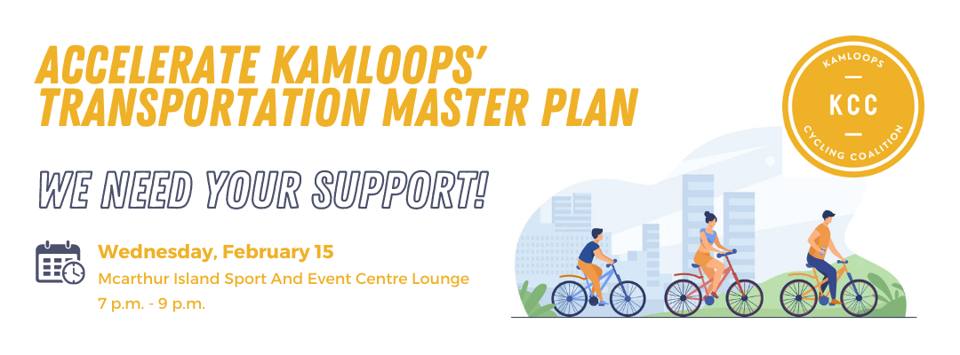 Our friends at the Kamloops Cycling Coalition (KCC) are working hard to make cycling infrastructure a priority in Kamloops. They need YOUR help prioritizing funding projects contained in the Kamloops Transportation Master Plan accelerated and delivered to the community over a 10-year period. Here's how you can help: